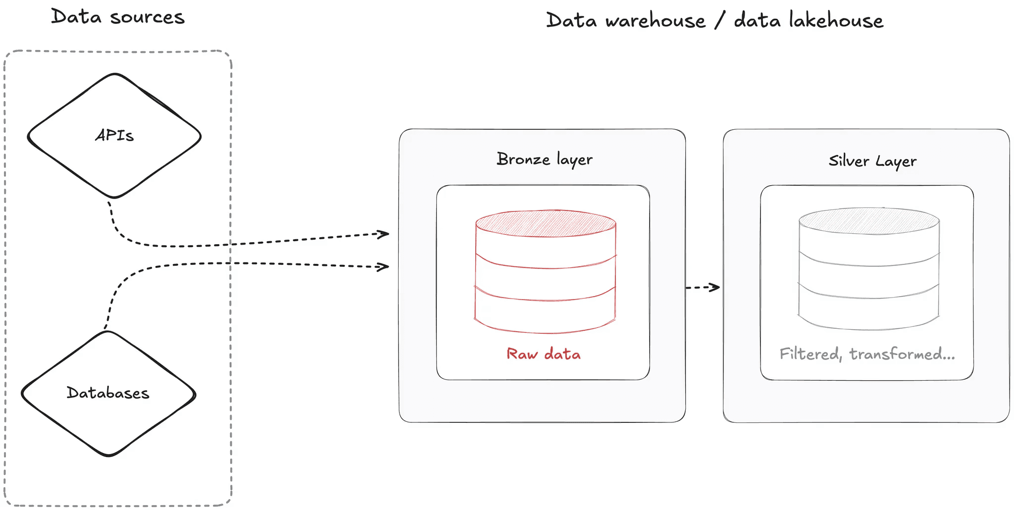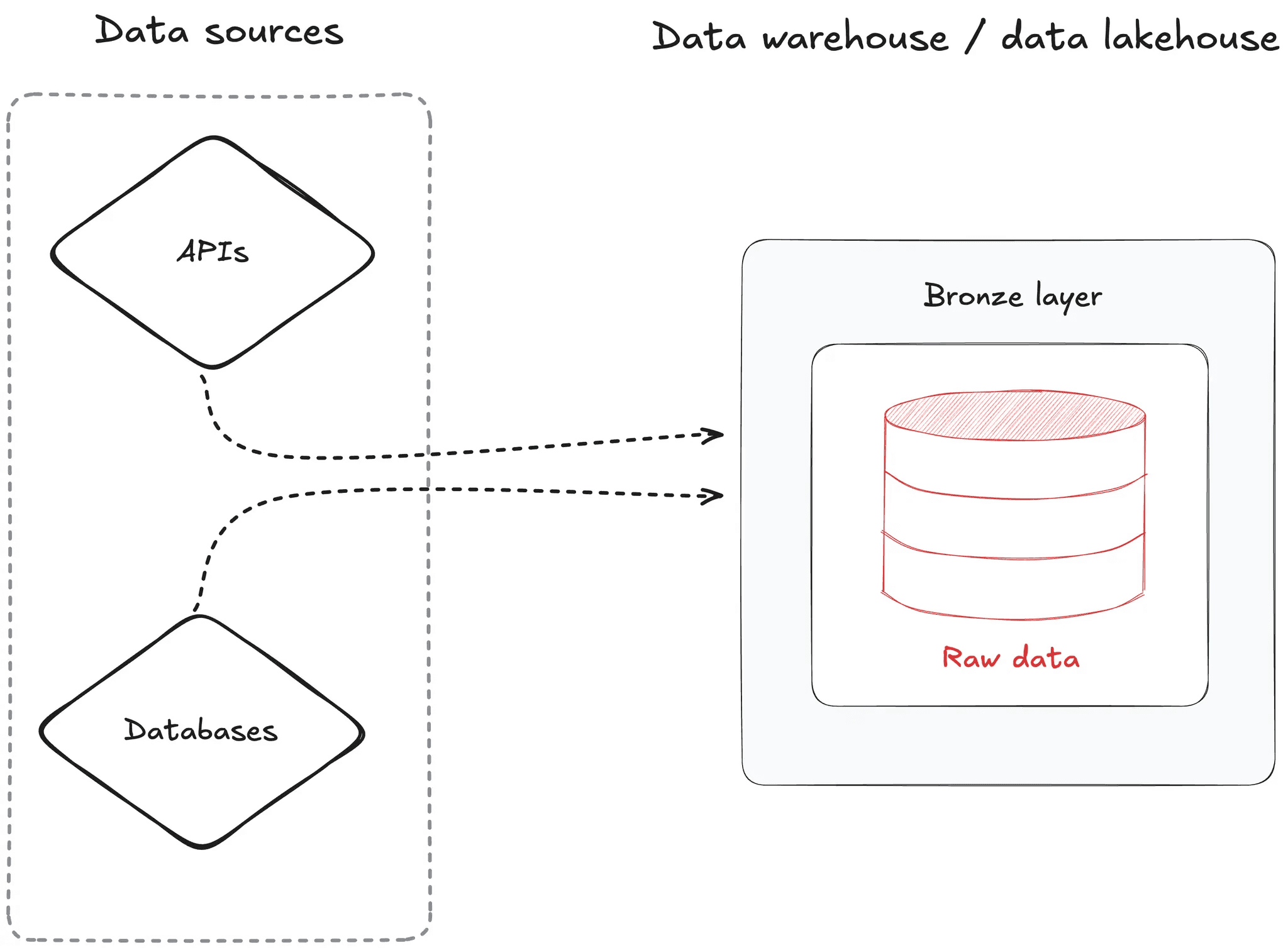 The Bronze layer stores data exactly as it arrives from source systems, with no significant transformations applied.