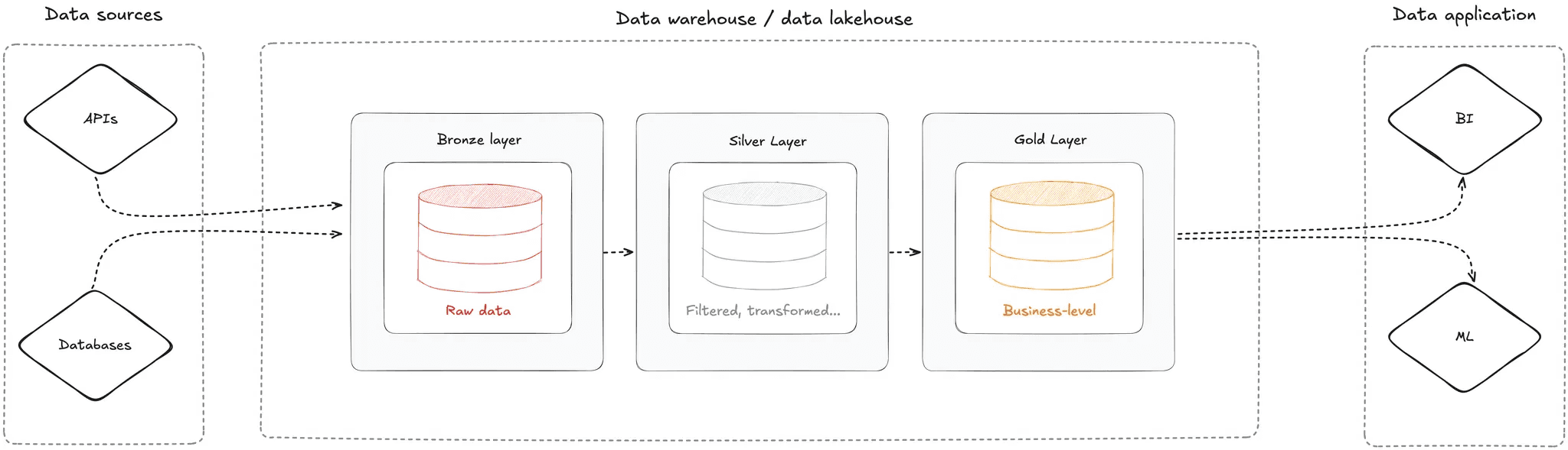 Medallion Architecture organizes data into three main layers, where each layer represents a higher level of refinement and value: