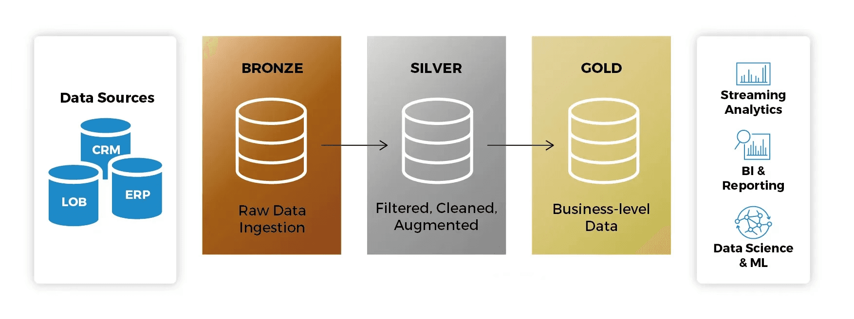 Bronze: The landing layer. Data is stored in its original format, allowing reprocessing when needed.